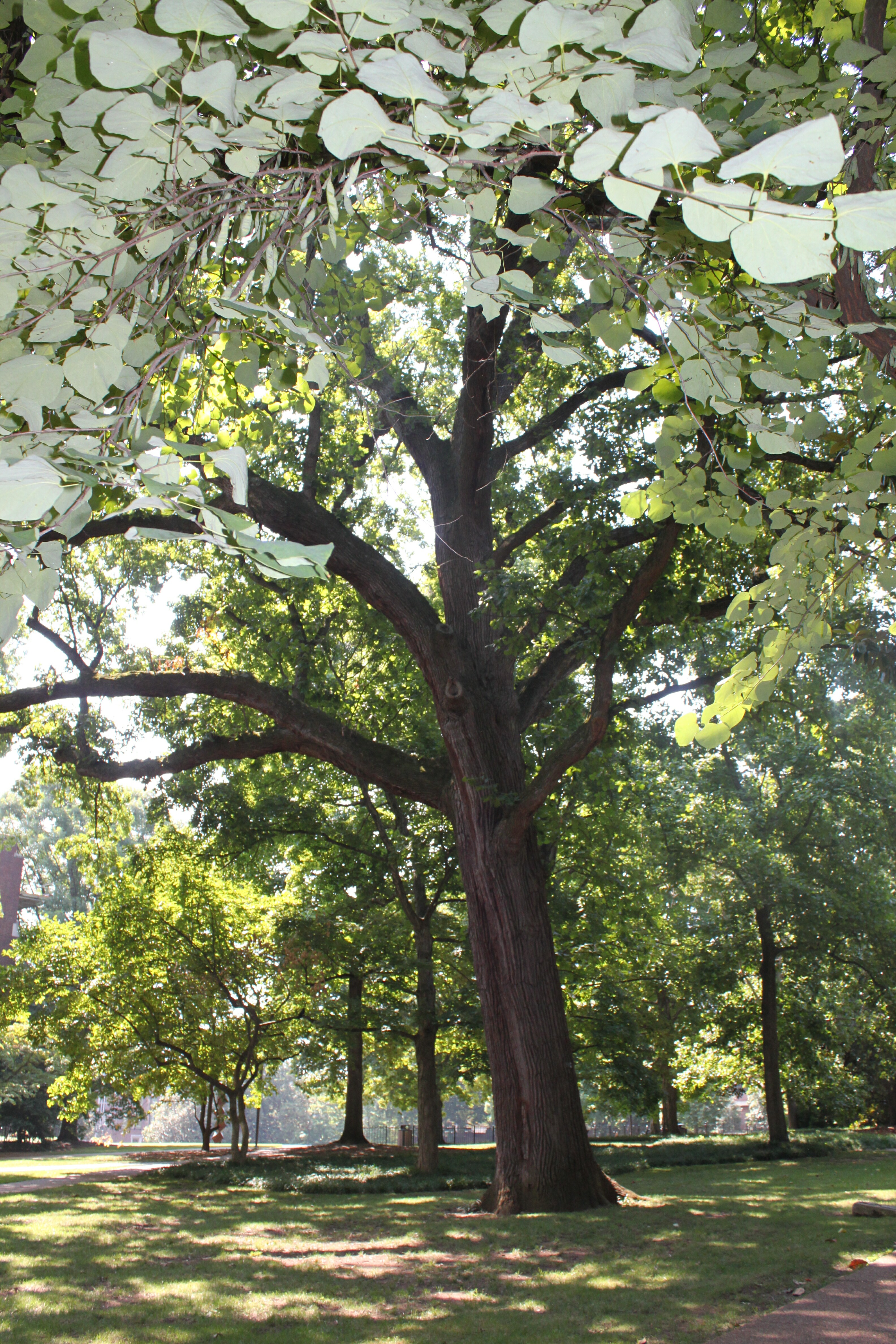 A shot of the Bicentennial Oak from underneath a redbud tree