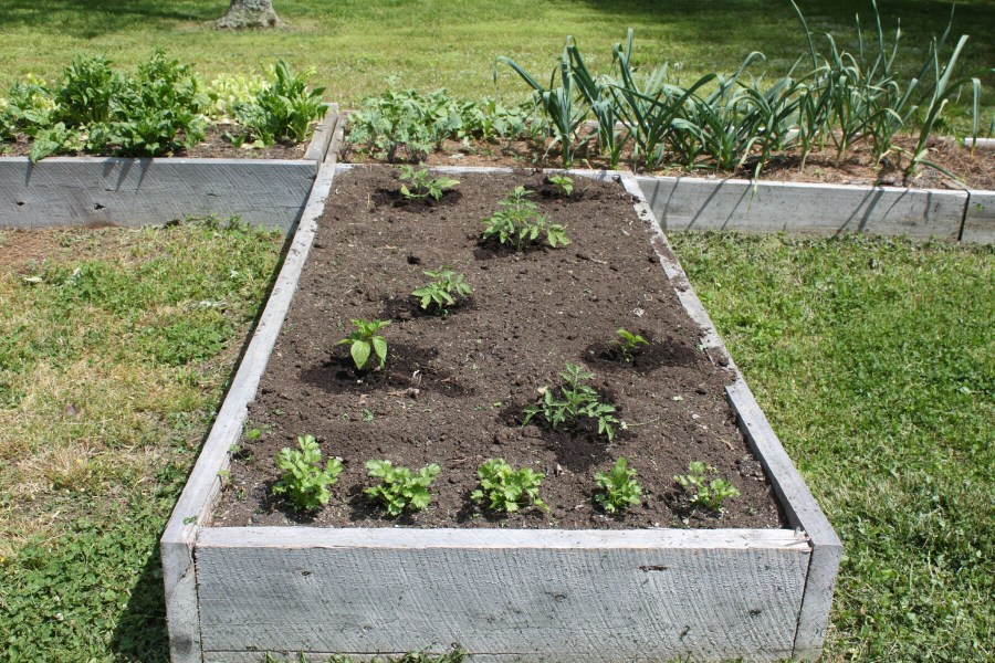 Spring 2014 Raised Beds – cilantro, garlic, jalapeno pepper, tomatoes – 07 May 201